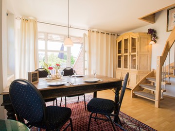 Ca. 75qm Wohnfläche verteilen sich auf ein Esszimmer mit offener Küche, einen Flur, ein modernes Duschbad/WC mit Fenster, ein Schlafzimmer mit Doppelbett und Schlafsofa und einem Wohnzimmer mit gemütlichem Eck-Ausziehsofa sowie einer kleinen Ledersitzgruppe für gemütliche Abende. Hierher führt eine offene Treppe.